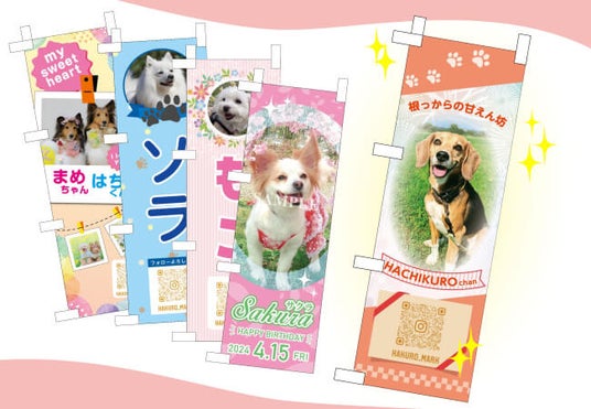 お気に入りのカラーとデザインで作れる「おさんぽミニのぼり」が登場!愛犬の名前入りで、交流イベントやお散歩がもっと楽しくなります。ペット仲間ともお近づきなるくきっかけにも。