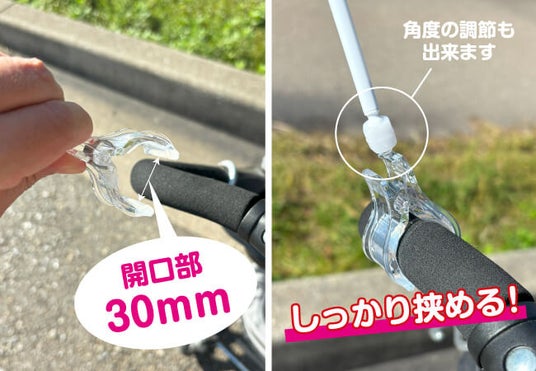 「おさんぽミニのぼり」はコンパクトなサイズで、30mmと大きく開くクリップを採用しているため、ペット用カートに簡単に取り付けられます。360°回転可能なので角度の調節も可能です。
