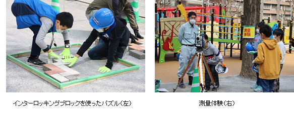 当日は、ワークショップ参加者が事前に描いた絵を印刷したモニュメントのお披露目や測量・モルタル塗りなどの工事体験を行うほか、新しい遊具を体験しました。