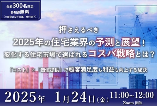 戸建住宅の地盤調査実績No.1のジャパンホームシールド株式会社*1(所在地:東京都墨田区、代表取締役社長:勅使河原隆巳)は工務店経営者向けウェビナー「2025年の住宅業界の予測と展望!変化する住宅市場で選ばれるコスパ戦略とは?」を2025年1月24日(金)に開催します。