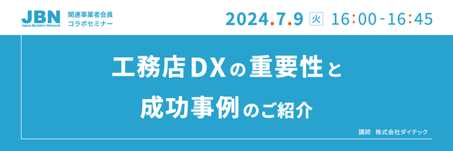 このたび、株式会社ダイテック(本社:東京都品川区、代表取締役社長:野村明憲 以下、ダイテック)と、一般社団法人JBN・全国工務店協会(本社:東京都中央区、会長:大野年司、以下JBN)は、7月9日(火)に「工務店DXの重要性と成功事例のご紹介」コラボセミナーを開催いたします。ご参加は無料、オンライン限定開催のセミナーです。