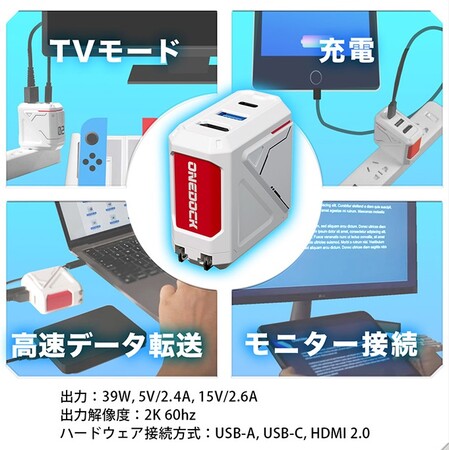 スマートミラーリング、充電器、接続ハブの3つの機能を備えたオールインワン・ギア「ONEDOCK(ワンドック)」。純正ドックがない環境でもこのカードサイズのワンドックがあれば、ケースを外すことなくテレビ接続して大画面でゲームをプレイできます。最大2K 60fpsでスマートフォンやノートパソコンからのスクリーンミラーリングに対応しており、39Wの出力で携帯電話・ノートパソコン・その他多くのデバイスを充電することもできる多機能ガジェットです。