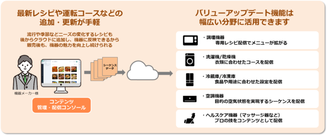また、当機能は、調理機器のレシピだけでなく、洗濯機における衣類に最適な洗濯コース、冷蔵機器の温度管理コース、マッサージ機器のプロマッサージコースなど、特定のシーケンス制御を後から追加する用途に幅広くご利用いただけます。