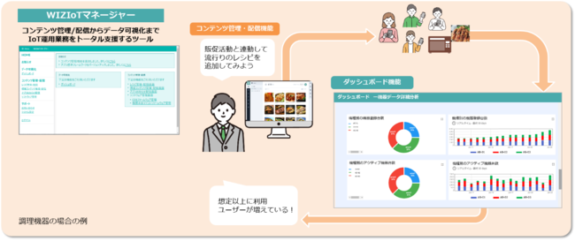 WIZIoTでは、多彩な調理メニューの写真・作り方などのレシピデータに加えて、最適な調理温度・時間などの調理シーケンスデータをクラウドで管理し、機器に配信できる仕組みをSaaSとしてご提供します。