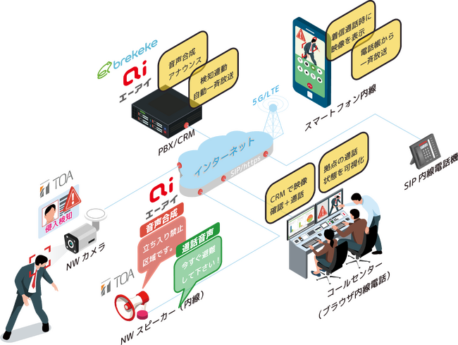 株式会社エーアイ(本社:東京都文京区、代表取締役社長:廣飯 伸一、証券コード:4388、以下エーアイ)は、ソフトウェアPBXの老舗ベンダーである株式会社日本ブレケケ(本社:埼玉県川越市、代表取締役:山出 晋)と業務用の音響機器や防犯・監視カメラなど映像機器の専門メーカーTOA株式会社(本社:兵庫県神戸市、代表取締役社長:谷口 方啓)と3社の製品をコラボレーションさせたセキュリティ検知連動自動放送システムを発表した事を本日7月26日にお知らせします。
