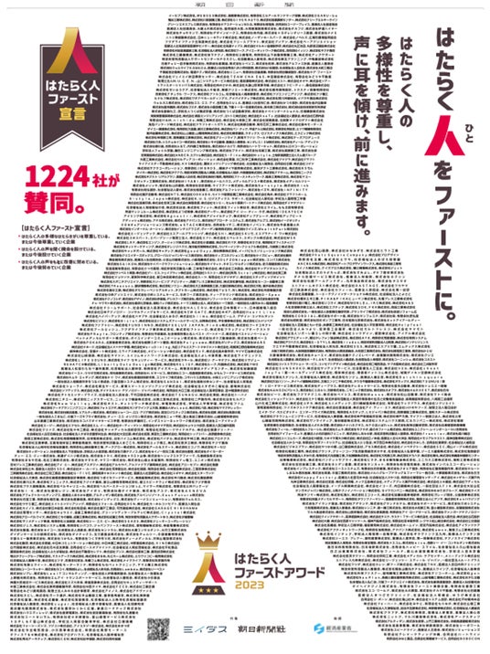 「はたらいて、笑おう。」をビジョンに掲げるパーソルグループのミイダス株式会社(本社:東京都港区、代表取締役社長:後藤喜悦)と株式会社朝日新聞社(代表取締役社長:中村史郎)が共催している「はたらく人ファーストアワード2023」(主催:ミイダス・朝日新聞社、後援:経済産業省)で公開した「はたらく人ファースト宣言」に1,224社が賛同しました。期待を上回る反響を受け、1月9日付朝日新聞朝刊全国版広告で、1,224社の企業名とともにメッセージを発信しました。