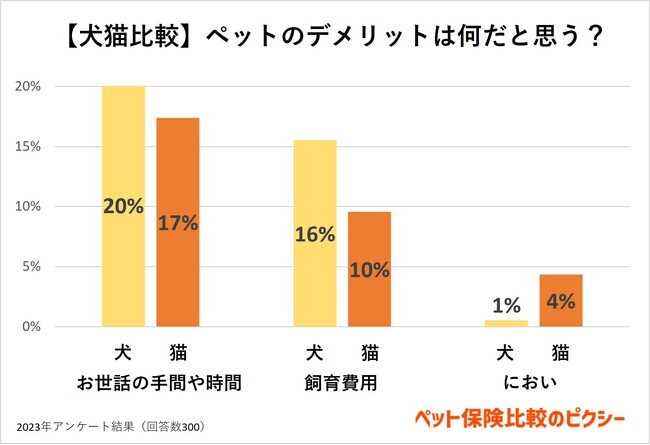 数字の差が見られたのは3つの回答です。「お世話に手間や時間がかかる」と「飼育費用がかかる」では犬の飼い主さまの割合が多く、「においが気になる」では猫の飼い主さまの割合が多くなっていました。