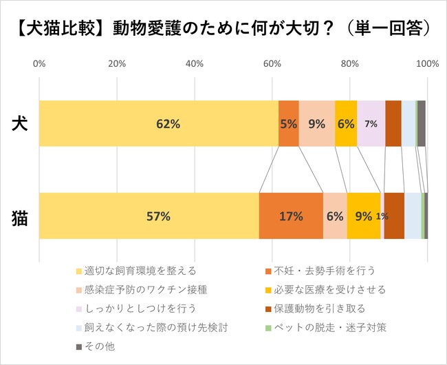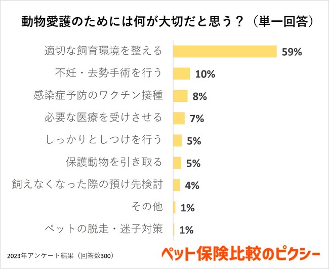 今回のアンケートでは、飼い主さまの多くが、動物愛護の観点から最も大切なのは「ペットにとって適切な飼育環境を整える」ことだと回答されました。