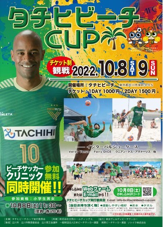 「タヒチビーチCUP」は、東京ヴェルディBSの拠点でもある東京都立川市における地域振興を目的として毎年開催されている、日本最大のビーチサッカー賞金大会です。今年も東京都立川市のタチヒビーチにて開催されます。