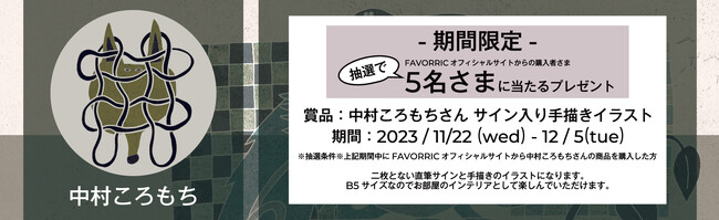 FAVORRIC参加を記念して11月22日(水)~12月5日(火)までの期間中、公式サイトにて中村ころもちさんの商品をご購入いただいた方の中から抽選で5名様に「サイン入りオリジナル手描きイラスト」プレゼント!