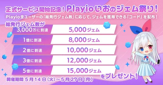 2024年5月14日(火)以降にPlayio全ユーザーへ発行したジェムの総数が以下の条件を達成した際に、アプリ内でジェムを獲得できるコードを公式X(旧Twitter)@Playio_io内にてポストします。