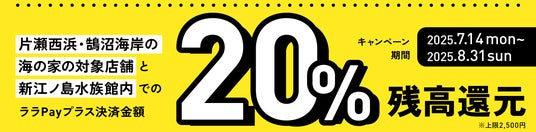 キャンペーン期間中に、ララPayプラスで「片瀬西浜・鵠沼海水浴場の海の家」の対象店舗を利用、または「新江ノ島水族館内の飲食・グッズ」を購入していただくと、累計決済金額の最大20%(上限2,500円)を残高還元します!