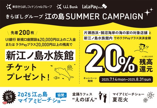 「金融にも強い総合サービス業」を将来像に掲げるきらぼしグループの株式会社きらぼし銀行(本店:東京都港区、頭取 渡邊 壽信、以下「きらぼし銀行」)、株式会社UI銀行(代表取締役社長 安田 信幸、以下「UI銀行」)、きらぼしテック株式会社(代表取締役社長 柳生 清貴、以下「きらぼしテック」)は、2025年7月14日(月)より「きらぼしグループ 江の島 SUMMER CAMPAIGN」を実施中!