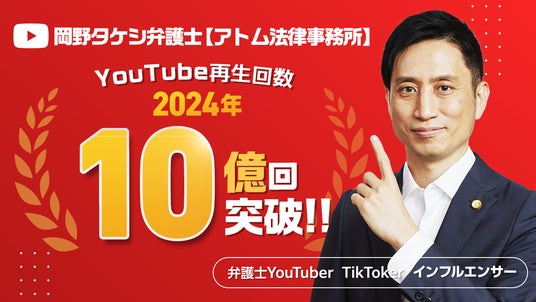 弁護士YouTuber『岡野タケシ弁護士【アトム法律事務所】』は、このたび、2024年の年間再生回数が10億回を突破しました。また、2022年から2024年までの3年間で再生回数30億回を記録。法律や世界の知識をテーマにした動画が幅広い視聴者層から支持を集めています。