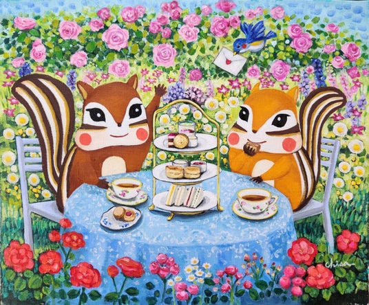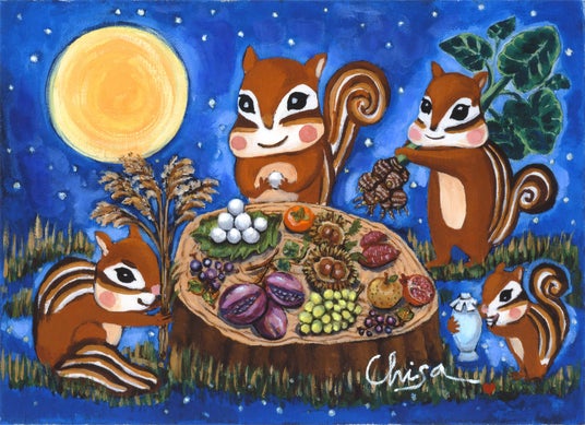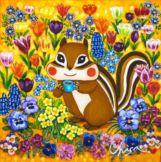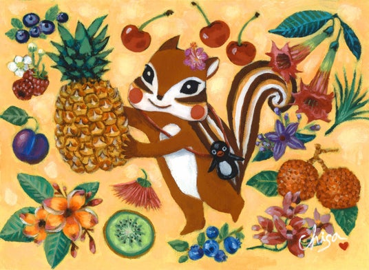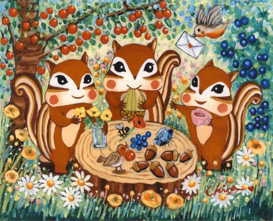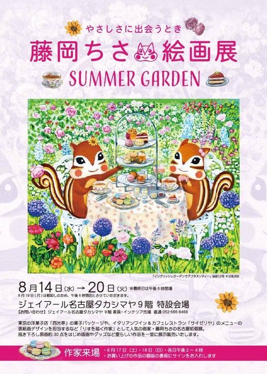 東京の洋菓子店「西光亭」の菓子パッケージやイタリアンワイン&カフェレストラン『サイゼリヤ』のメニューの表紙画のデザインを手掛けるなど、「りすを描く作家」として人気の画家・藤岡ちさ の名古屋初個展を、ジェイアール名古屋タカシマヤにて開催中です。週末の17日(土)18日(日)は作家来場し、ご購入作品(額裏面)にサインを入れるなどの特典がございます。このお盆は暑さを吹き飛ばすほど可愛いりすとその仲間たちに会いにゆこう!