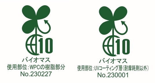 従来は100%石油由来の樹脂を使用していましたが、『バイオリーフ』シリーズでは、WPC樹脂とコーティング塗料の両方に植物由来の原料を配合し、石油由来材料の使用量を約10%削減しました。どちらもバイオマスマークを取得しています。