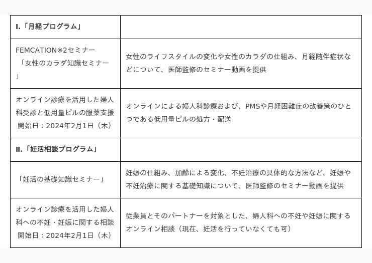 プログラムを通じて日清食品グループの社員を対象に、婦人科医師監修のセミナー動画や、医療機関と連携したオンライン診療サービスの提供を行います。これにより、月経随伴症状の改善や、不妊治療と仕事の両立などに関する不安軽減、女性の健康課題への全社的な理解促進を支援します。