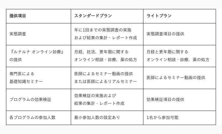 月経・妊活・更年期に対してオンライン診療の実施から効果検証まで可能なスタンダードプランと、一部機能を簡易化し女性従業員1名からでも利用可能なライトプランから選択でき、導入する企業のニーズに合わせた支援を実施します。