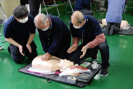 当財団から提供された器具を使って、応急手当の方法を指導する資格(応急手当普及員など)を持った指導員が、自治会や学校等で講習を実施し、救命処置の普及啓発を行います。