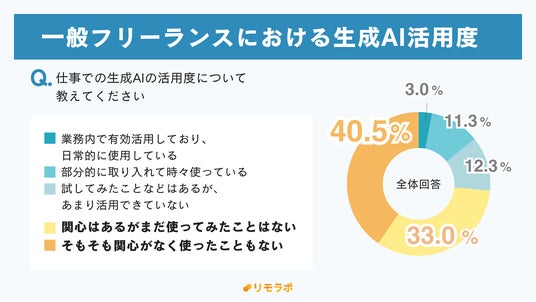 また、「試してみたことなどはあるが、あまり活用できていない」が12.3%、「使ったことがない」人が73.5%と、一般フリーランスへの生成AIの浸透度が低いことが分かります。