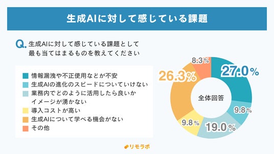 また、生成AI活用に対する課題として、「情報漏洩や不正使用などが不安(27%)」、「生成AIについて学べる機会がない(26.3%)」など、安全性や学ぶ機会の少なさについての回答が目立ちました。