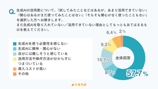 一般フリーランスで生成AI活用に至っていない人の中で、まだ生成AIを取り入れていない/活用できていない理由第1位は「生成AIを使う必要性を感じない(57.7% )」でした。