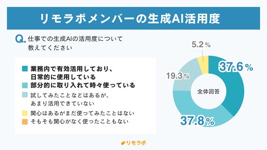 一方、リモラボメンバーにおける生成AI活用度は、75.4%が日常的または部分的に活用できているという結果となり、一般フリーランスに比べて高水準であることが分かりました。