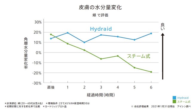 AIR はスチームの約 1/600、ウルトラファインバブルや帯電微粒子イオンよりも小さい約 1.4nm(ナノメートル)の大きさで、電荷を帯びず、極性を持たず、生体に作用しやすく、水粒子の構造が安定しており、肌の深層(角質層)まで届きます。スチームと異なり体温に近い温度で放出されるため肌に優しく、水だけの塊なので、毎日安心して使用できます。