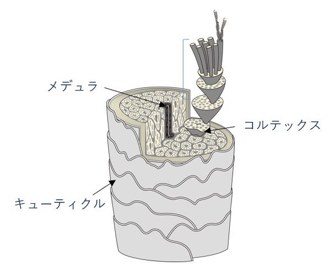 加齢と共に髪がパサついたり、うねりが現れたり、ハリやコシが無くなったり、細くなったりする現象を髪のエイジングと言います。これらが起こる要因の一つとして、血行不良などにより栄養素が髪を作る毛母細胞に送られにくくなった事が挙げられるでしょう。エイジングが始まった髪はそのものの構造変化まで引き起こし始めます。髪はキューティクル・コルテックス・メデュラで構成されています。エイジング毛はキューティクルが薄くなり、コルテックスを構成するタンパク質が少なくなり、また毛髪内部に留まっている水分が減少し、それが原因となり髪のうねりや、