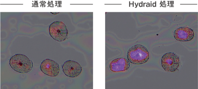 ドライ時や薬剤浸透時間にHydraidを当てることで、髪と同時に地肌の水分環境を整えます。薬剤の浸透を促進することで、例えばカラー剤では、パワーの弱い薬剤でも明度を上げやすくすることで、髪や地肌のダメージを軽減します(パワーの強い薬剤を用いた場合との比較)。