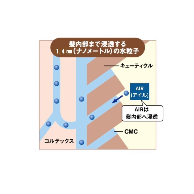 ・目に見えない極小の水粒子「AIR」が、髪の内部にまでしっかりと入りこむから、キューティクルは柔らかくなり自然に閉じて、入りこんだ水分は定着し、柔らかさ・ツヤを持続させます。