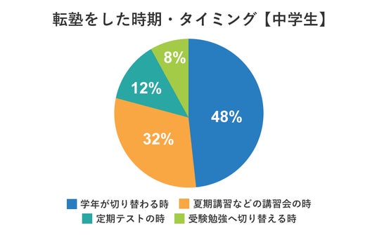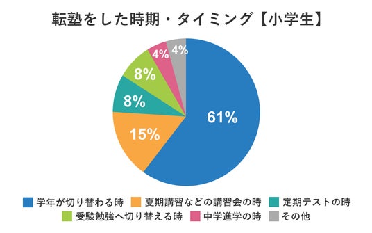 次に多かったのは、「夏期講習など講習会の時」。長期講習で塾の雰囲気や講師との相性を見極めた上で転塾をしている家庭も多くあるようです。また、「テストの時」や「受験勉強に切り替える時」など、学習イベントを契機に転塾するケースも見られました。