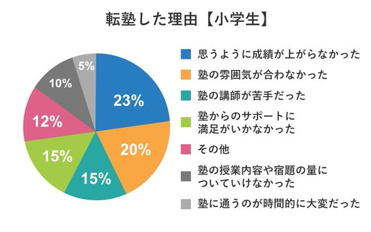 転塾の理由として最も多かったのは「成績が上がらなかった」ことで、全体の約20%。続いて「塾の雰囲気が合わなかった」や「塾の講師が苦手だった」という、環境や塾内での人間関係が転塾の理由として挙げられています。また、「塾からのサポートに満足がいかなかった」や「授業内容や宿題の量についていけなかった」といった塾のサービスやカリキュラム面での不満が転塾理由という意見もあります。