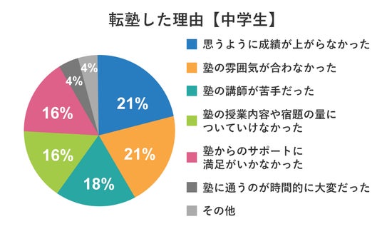 調査によると、中学生の保護者が転塾を考える主な理由は「思うように成績が上がらなかったから」と「塾の雰囲気が合わなかったから」がそれぞれ約21%と最も多い結果となりました。これらの理由は小学生の結果とも共通しており、成績の向上が期待できなかった、塾の雰囲気が合わなかったということが塾の変更を検討する大きな要因となっていることがわかります。
