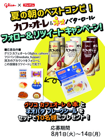 「8月1日はふたつの記念日」をテーマに、そのままでおいしいマーガリン入りである「ネオバターロール」と、冷えた「カフェオーレ」が夏の朝食にぴったりの組み合わせであることを、店頭でのクロスMD販促で訴求し、両商品のキャラクターが愛らしく出会うアニメーションをSNSで公開します。また、Twitterでのプレゼントキャンペーンを展開します。