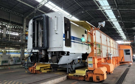 トラバーサとは、新幹線の検査を工場内で行うために新幹線を1両ずつ切り離して移動させる装置です。切り離された新幹線車両の移動を間近でご覧いただけます。