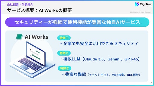 - - 自社開発の法人用GPT「AI Works」は、企業の機密情報を安全に扱える高度なセキュリティ機能を実装しています。今後も、企業情報の保護を最優先事項と位置づけ、さらなる強化を進めていきます。