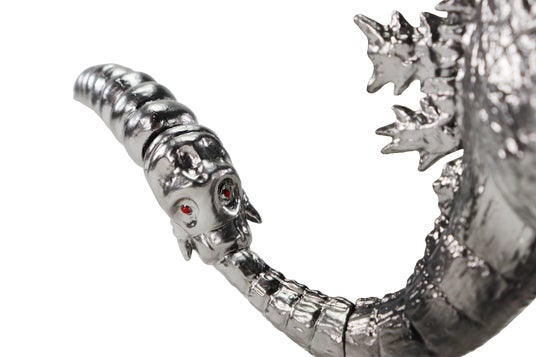 全身が光り輝くシルバーに包まれ、まるで重金属で全身が構成されているかのような姿は、汚染物質を吸収して成長するという特徴を持つヘドラに非常にマッチしたカラーリングとなっています。