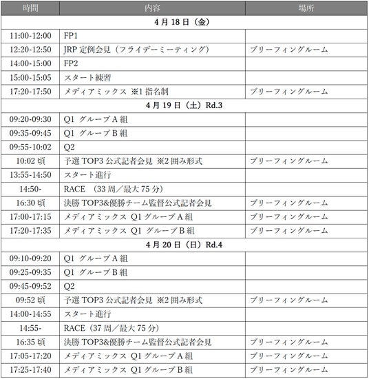 日頃より格別のご高配を賜り厚く御礼申し上げます。4月18日(金)から20日(日)の3日間、モビリティリゾートもてぎ(栃木県茂木町)で開催されます「2025年 全日本スーパーフォーミュラ選手権第3戦・第4戦」につきまして、下記の通りご案内いたします。メディアの皆様におかれましては、何卒ご取材賜りますようよろしくお願い申し上げます。