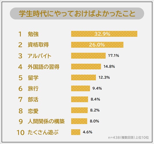 学生時代にやっておけばよかったことの1位は「勉強(32.9%)」。2位「資格取得(26.0%)」と答えた人も多くなりました。学生の本分とも言える勉強が不十分だったことを後悔している人が多数。