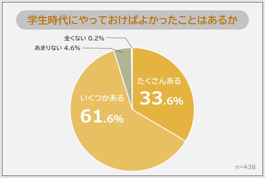 社会人438人に「学生時代にやっておけばよかったと思うことがあるか」を聞いたところ、「たくさんある」「いくつかある」と答えた人が9割以上。学生時代に何かしら心残りのある人が多いとわかりました。