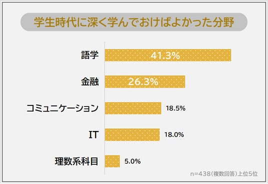 続いて「学生時代にもっと深く学んでおけばよかった分野」を聞いたところ、もっとも多かった回答は「語学(41.3%)」で、全体の4割を占めました。2位「金融(26.3%)」、3位「コミュニケーション(18.5%)」、4位「IT(18.0%)」が続きます。