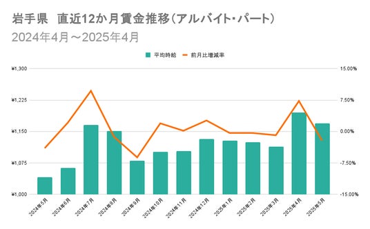 岩手県では、2024年6月から7月および2025年3月から4月にかけて、複数の企業が高時給の塾講師求人を掲載したことで平均時給が一時的に大きく上昇しました。しかし、5月にはこうした求人が減少し、平均賃金も前月比で26円下落しています。新学期に向けた求人需要が一巡したことが影響していると考えられます。