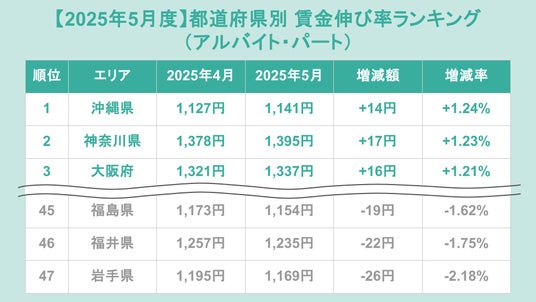 アルバイト・パートの都道府県別賃金伸び率ランキング(前月比)トップ3は、1位が沖縄県(増加額+14円、増加率+1.24%)、2位が神奈川県(増加額+17円、増加率+1.23%)、3位が大阪府(増加額+16円、増加率+1.21%)でした。