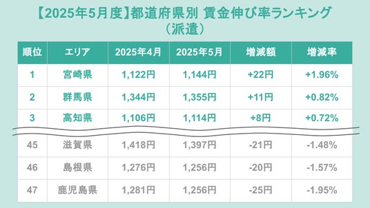 派遣の都道府県別賃金伸び率ランキング(前月比)トップ3は、1位が宮崎県(増加額+22円、増加率+1.96%)、2位が群馬県(増加額+11円、増加率+0.82%)、3位が高知県(増加額+8円、増加率+0.72%)でした。
