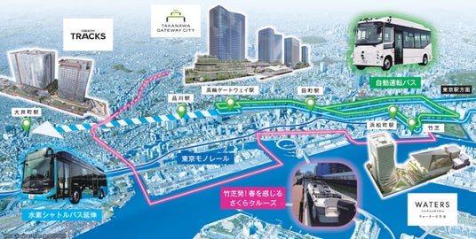 3月28日の「広域品川圏本格始動」にあわせ、WATERS takeshibaとTAKANAWA GATEWAY CITYを結んで運行している「JR竹芝水素シャトルバス」と接続するかたちで、TAKANAWA GATEWAY CITYとOIMACHI TRACKSを結ぶ水素シャトルバスを試行的に平日限定で運行を開始します。また、4月1日からは 既存のルートをめぐる便が新たに新橋へ停車します。本バスは走行時にCO2を排出しないゼロエミッション・モビリティであり、運行により来街者の利便性向上とともに、先進技術による環境価値を体感する移動体験を提供します。
