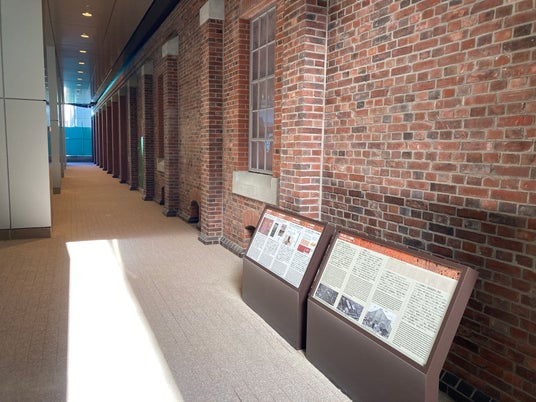 本開発に伴い東京駅開業の翌年の大正4年建設のレンガ車庫の壁面の一部(約40m)を、OIMACHI TRACKS BUSINESS TOWER 1階に移設・保存しました。施工にあたっては、本開発工事の施工者である竹中工務店の特許技術である「モルトール(R)」をレンガに応用し、レンガひとつひとつを再生。状態のよいレンガは表層部に再利用することで創建時の風合いを可能な限り継承しています。さらに、創建時の鋼製サッシなどレンガ以外の部材についても、記憶を留める貴重な要素として再利用しました。