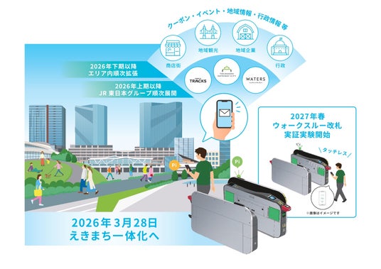 2026年3月28日より、改札の「タッチ」を契機に「広域品川圏コミュニケーションポータル」を通じて、「まち情報」を配信するサービスを実証開始します。TAKANAWA GATEWAY CITY、OIMACHI TRACKS、WATERS takeshibaの「まち情報」に加えて、順次、地域、商店街等に範囲を拡大していきます。「えき」と「まち」の情報をつなぎ、新しい回遊創出による顧客体験価値最大化と地域経済活性化のモデル創出を目指します。