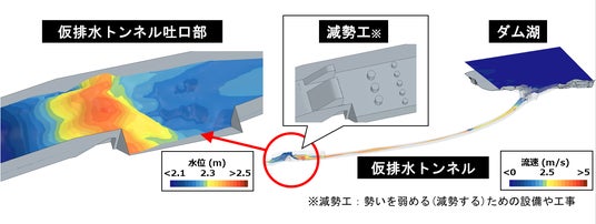 仮排水トンネルは既存ダムのゲート放流によるダム施工時の被災リスクを軽減するために代替放流設備を設けて、流水を迂回させるためのものです。ダム湖から下流に通じる仮排水トンネルをモデル化し、所定の水位を想定した解析を行いました。その結果、仮排水トンネル吐口(出口)部において、水の勢いを弱める減勢状況および跳ね返る流れを再現でき、仮排水トンネルの流量及び放流状況の把握が可能となりました。(※10)