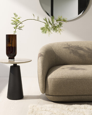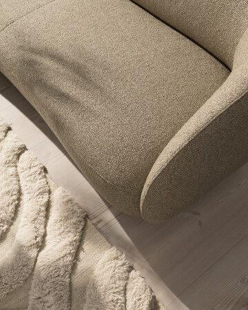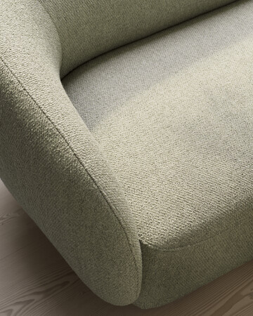 モートン・ゲオーセンがデザインした、丸みを帯びたオーガニックなシルエットは、曲線を描くフレームと、ふっくらとしたシートで構成されており、まるで繭に包み込まれるかのような座り心地が特徴です。例えば、落ち着いたニュートラルな色合いのLazio Brownのブークレなど、質感のあるテクスチャーと組み合わせることで、より心地良い味わいを創り出すことができます。